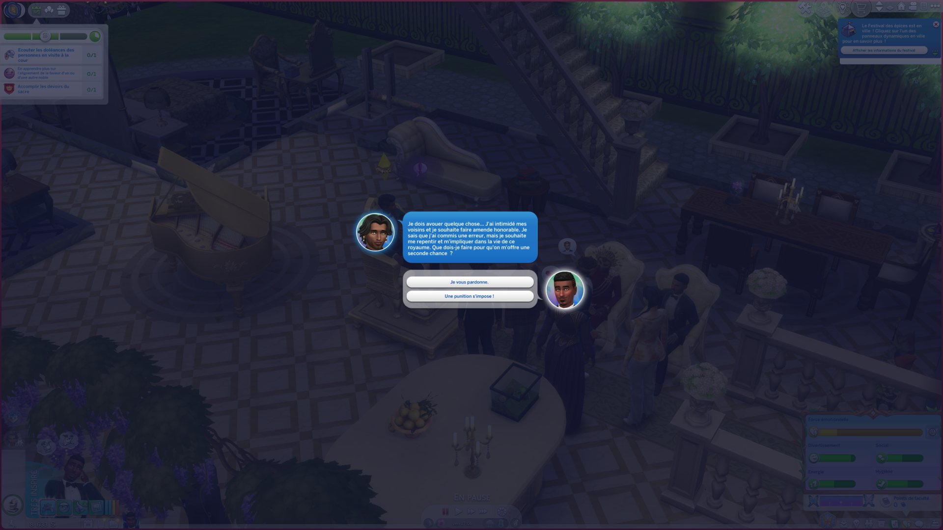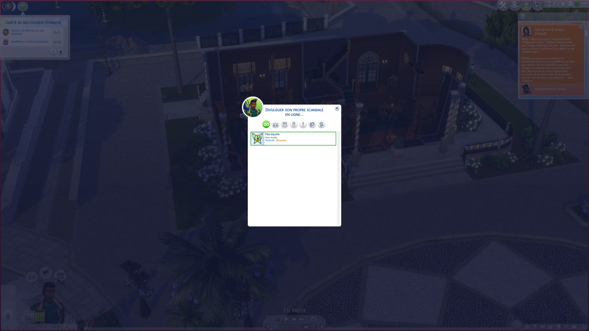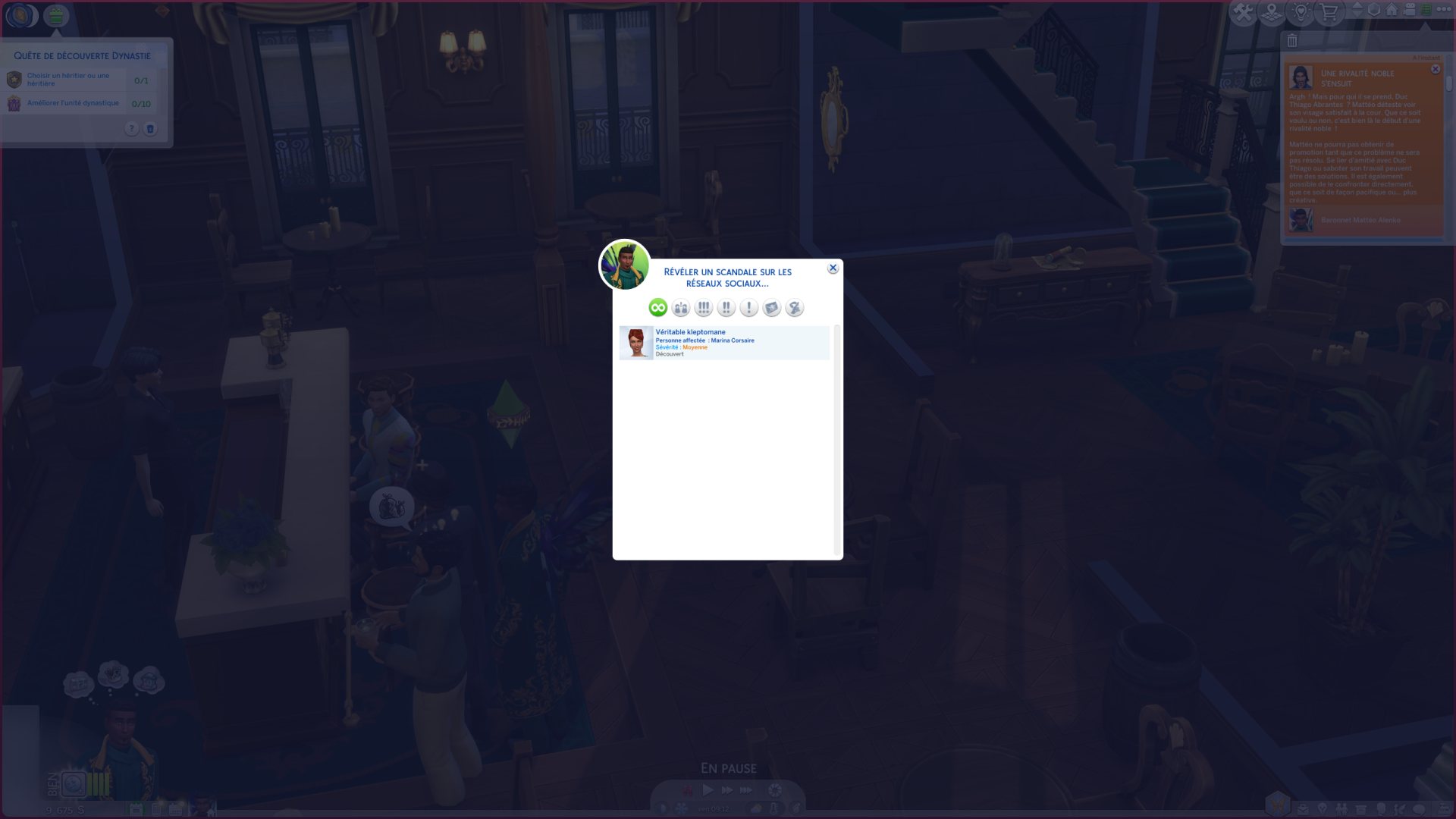 Une grosse partie du gameplay tourne autour de la notion de rivalité et de secrets. Dès qu'un Sim effectue une action répréhensible, cela génère un secret. Je me suis retrouvée embringuée dans toute une histoire. Du jour au lendemain, le Duc Thiago est devenu mon rival, il n'appréciait pas la gueule de Mattéo et ça bloquait sa progression dans la carrière noble.