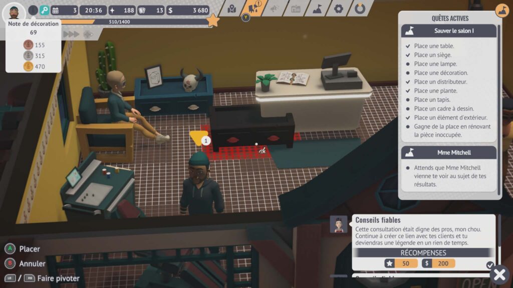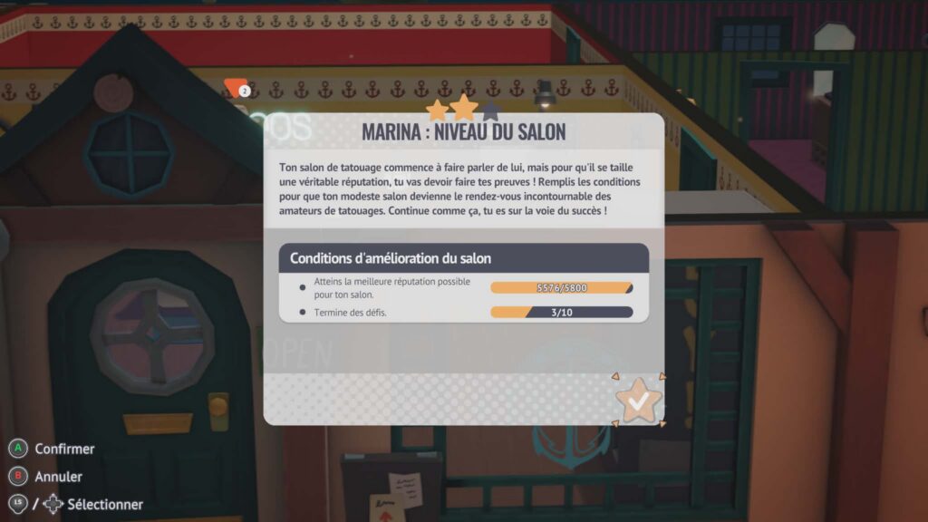 Le cœur de l’expérience repose évidemment sur la réalisation des tatouages, mais Tattoo Tycoon ne se limite pas à cette seule mécanique. Si les premières heures sont centrées sur la précision, la propreté du matériel et la gestion du temps pour satisfaire les clients, la progression ouvre rapidement de nouvelles perspectives. Le système d’étoiles joue ici un rôle clé : une fois les deux premières obtenues, de nouveaux salons deviennent accessibles, offrant un changement d’environnement mais aussi de nouveaux enjeux économiques et esthétiques. La troisième étoile, elle, demande davantage d’implication, puisqu’elle s’obtient en enchaînant les défis proposés par le jeu et en soignant la décoration du salon. Ce n’est plus seulement une question de technique, mais d’image et de gestion globale.