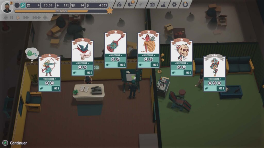 Autre élément intéressant, la possibilité d’embaucher un employé vient enrichir la dimension stratégique. On peut lui confier soit la réalisation des tatouages, soit les consultations avec les clients, ce qui change complètement la dynamique. On ne se contente plus d’exécuter chaque tâche soi-même, on commence à déléguer, à optimiser son organisation, à penser en véritable gestionnaire plutôt qu’en simple artisan. Ce glissement progressif, du tatoueur passionné au chef d’entreprise, donne un peu plus de profondeur au gameplay et renforce la sensation d’évolution sur la durée.