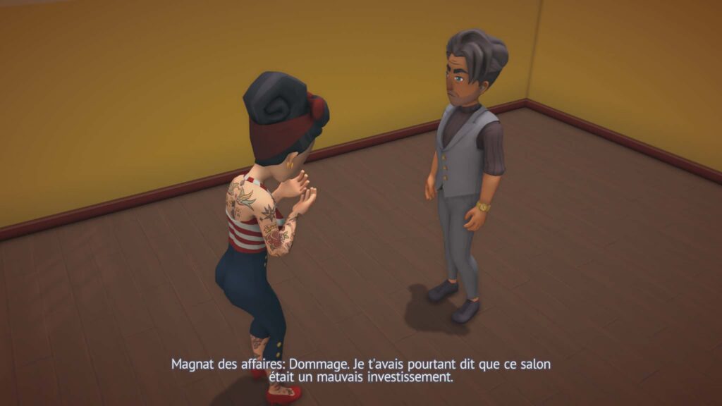 On y incarne un tatoueur qui décide de reprendre le salon de Maud, sa cheffe, alors que celle-ci est sur le point de fermer définitivement. Maud, dépassée par les difficultés financières, n’a plus vraiment d’options, et c’est là que le joueur intervient avec l’idée un peu folle mais ambitieuse de sauver le salon de la fermeture. Ce point de départ, simple mais efficace, donne un véritable sens à la progression : il ne s’agit pas seulement de faire grimper des chiffres, mais de redonner vie à un lieu qui compte. Au fil de l’évolution et du déblocage de nouveaux salons, on rencontre d’autres artistes tatoueurs, chacun avec sa personnalité, son style et son propre parcours. Ces échanges apportent une dimension plus humaine à l’ensemble et donnent le sentiment d’intégrer progressivement une communauté artistique. Le jeu ne transforme pas cette trame en grande fresque scénaristique, mais il s’en sert intelligemment pour donner un peu d’âme à la gestion pure, et ça fonctionne plutôt bien.