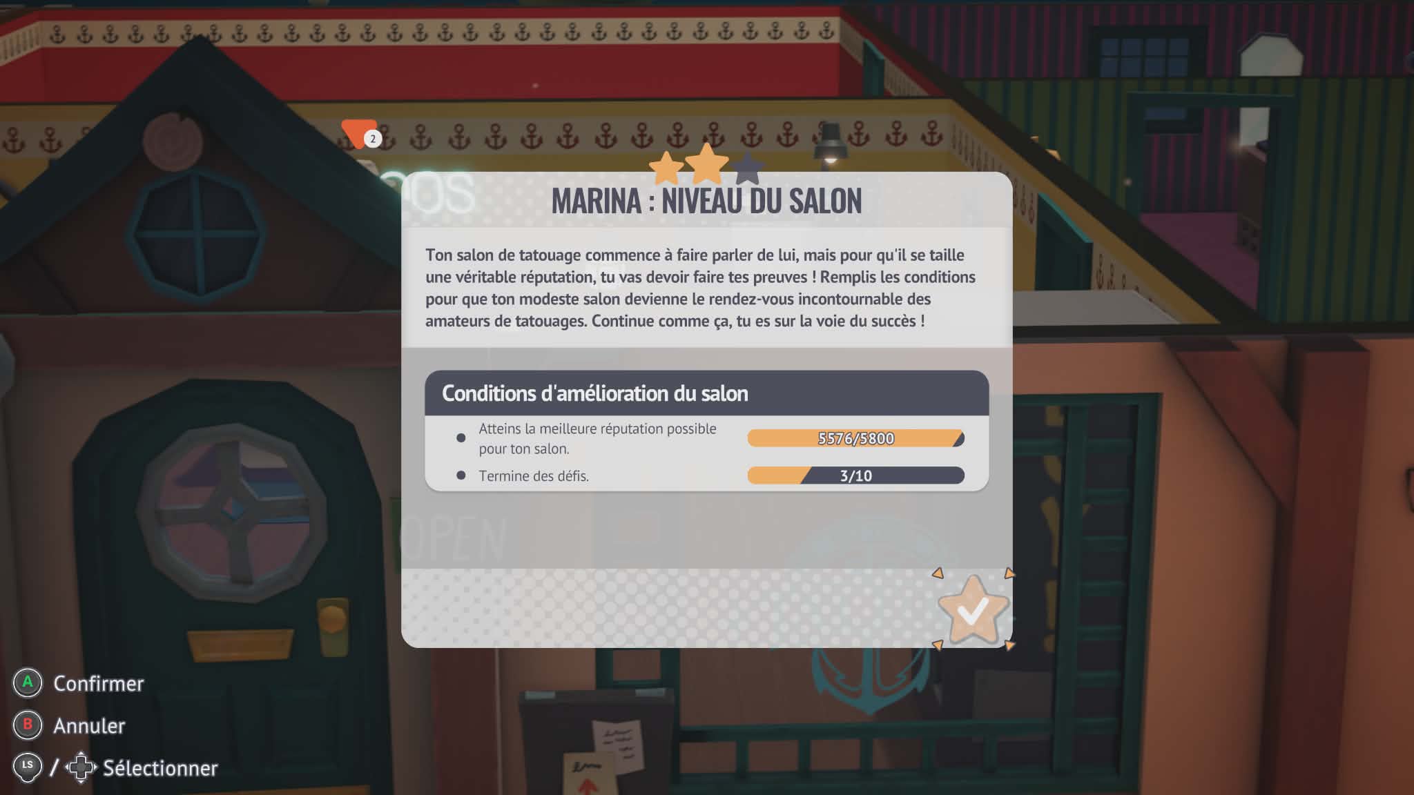 Le cœur de l’expérience repose évidemment sur la réalisation des tatouages, mais Tattoo Tycoon ne se limite pas à cette seule mécanique. Si les premières heures sont centrées sur la précision, la propreté du matériel et la gestion du temps pour satisfaire les clients, la progression ouvre rapidement de nouvelles perspectives. Le système d’étoiles joue ici un rôle clé : une fois les deux premières obtenues, de nouveaux salons deviennent accessibles, offrant un changement d’environnement mais aussi de nouveaux enjeux économiques et esthétiques. La troisième étoile, elle, demande davantage d’implication, puisqu’elle s’obtient en enchaînant les défis proposés par le jeu et en soignant la décoration du salon. Ce n’est plus seulement une question de technique, mais d’image et de gestion globale.