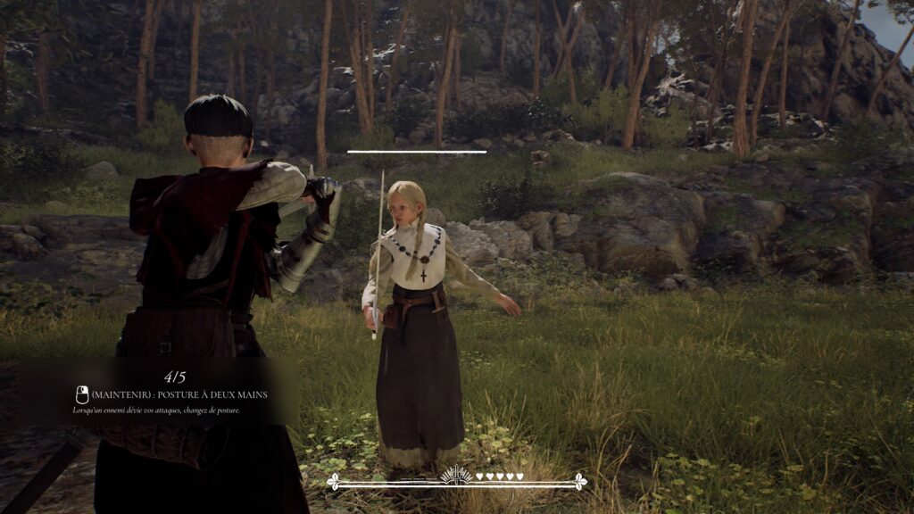 - la 1ère à une main. Le clic gauche sert aux attaques légères. On peut charger une attaque lourde en le maintenant enfoncé. La touche ALT est utilisée pour l'esquive. Le clic droit est dédié à la parade. Le timing est crucial.