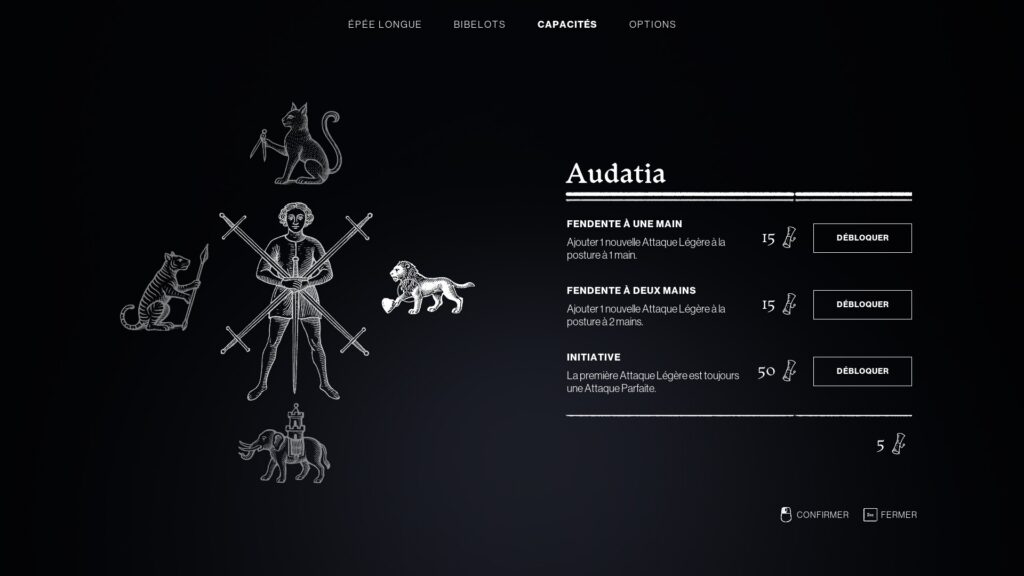 Les capacités de notre héroïne, quant à elles, sont divisées en plusieurs catégories, comme Prudentia qui se concentre sur la santé, la garde et l'efficacité des consommables ou Audatia qui concerne les attaques légères. Plus tard, deux autres catégories pourront être débloquées. Ses améliorations utilisent du papier qui se trouve un peu partout.