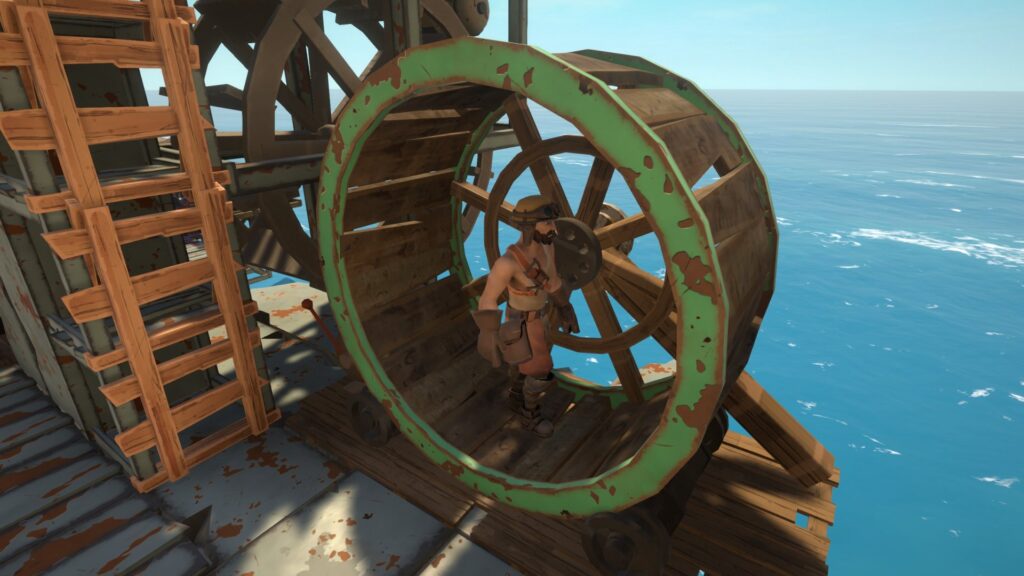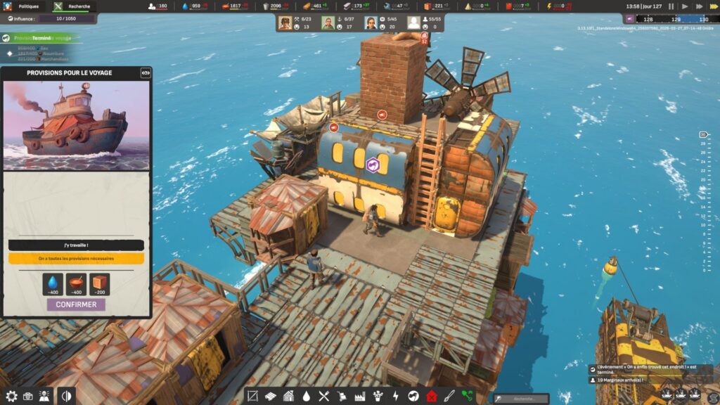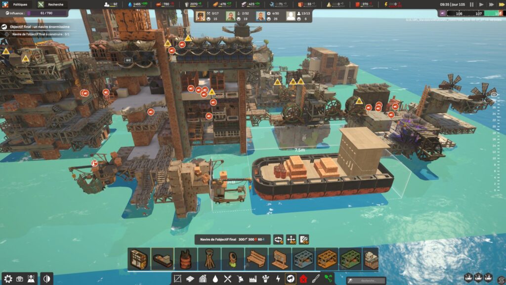 Dans le niveau que j'ai joué, le niveau de la mer descend au fur et à mesure, ce qui débloque peu à peu, au gré des marées, l'accès aux étages inférieurs des immeubles, avec à chaque fois de l'espace et des ressources. L'objectif final est de bâtir un gigantesque navire afin de s'échapper vers de nouveaux horizons.