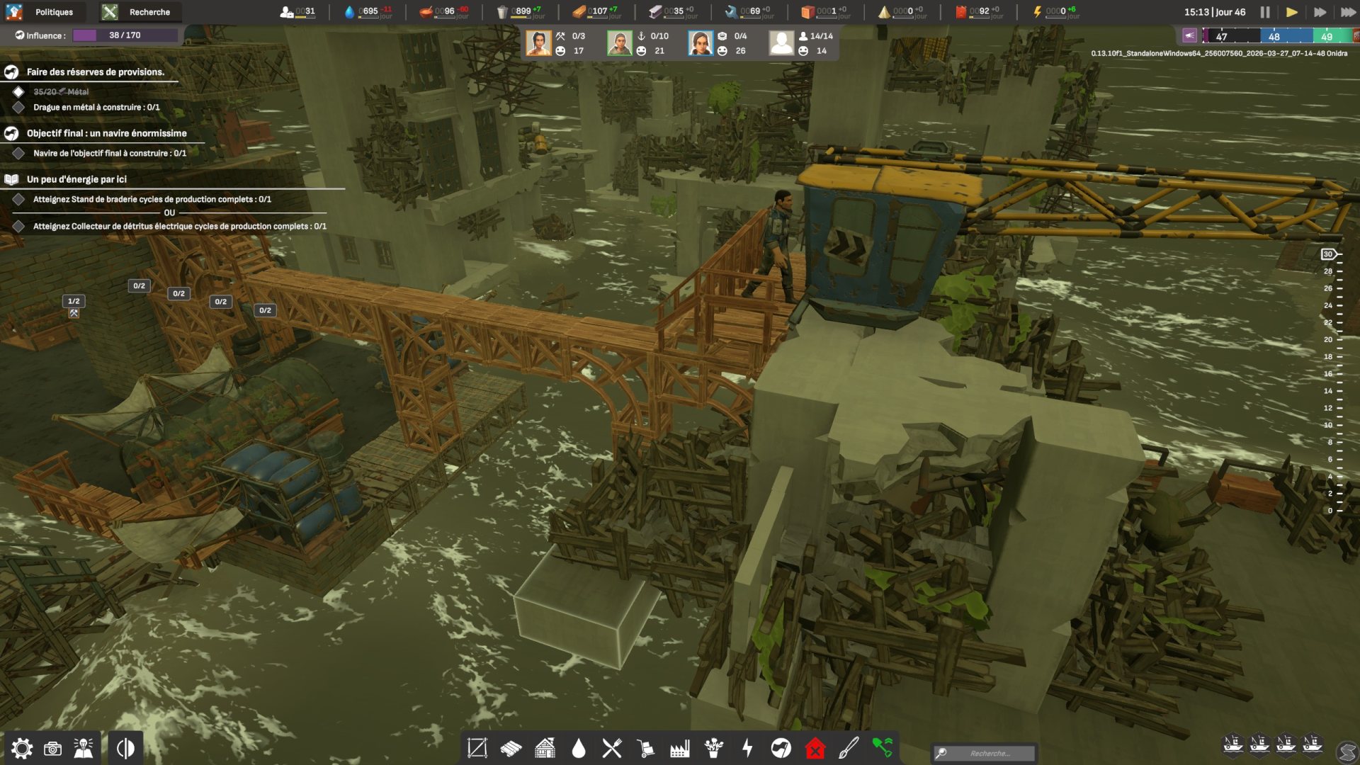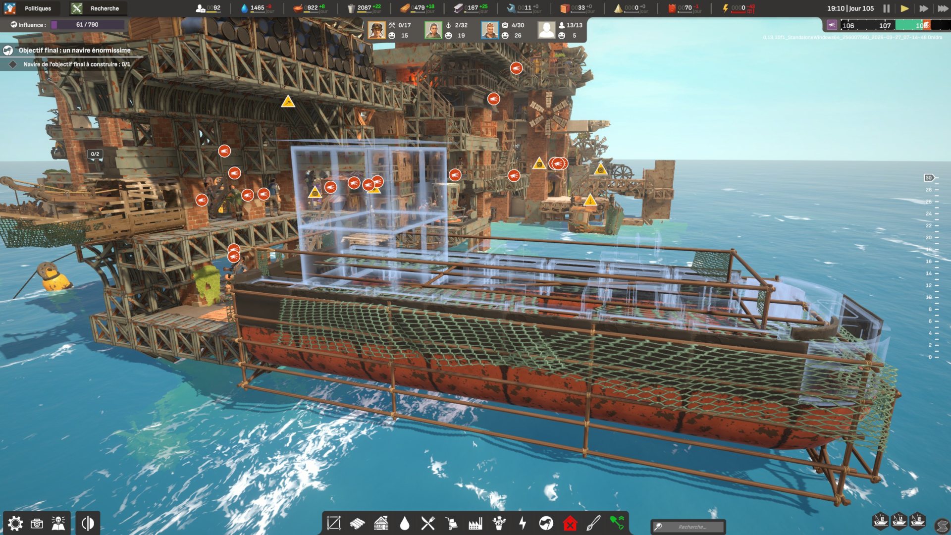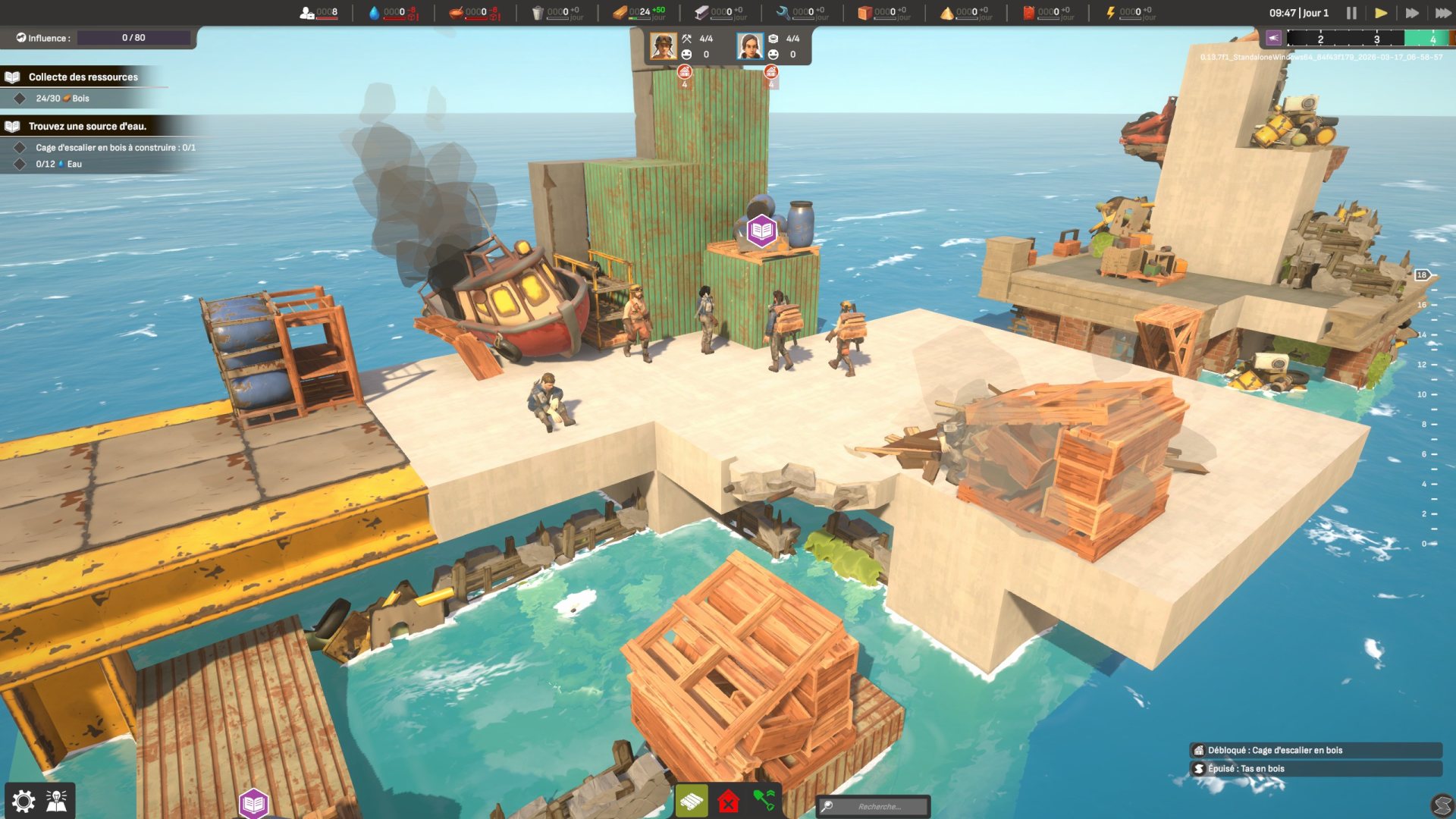 Dans le niveau que j'ai joué, le niveau de la mer descend au fur et à mesure, ce qui débloque peu à peu, au gré des marées, l'accès aux étages inférieurs des immeubles, avec à chaque fois de l'espace et des ressources. L'objectif final est de bâtir un gigantesque navire afin de s'échapper vers de nouveaux horizons.