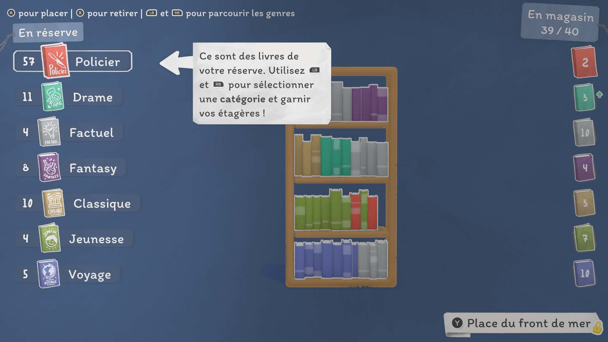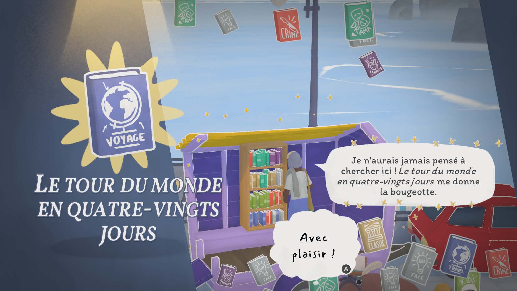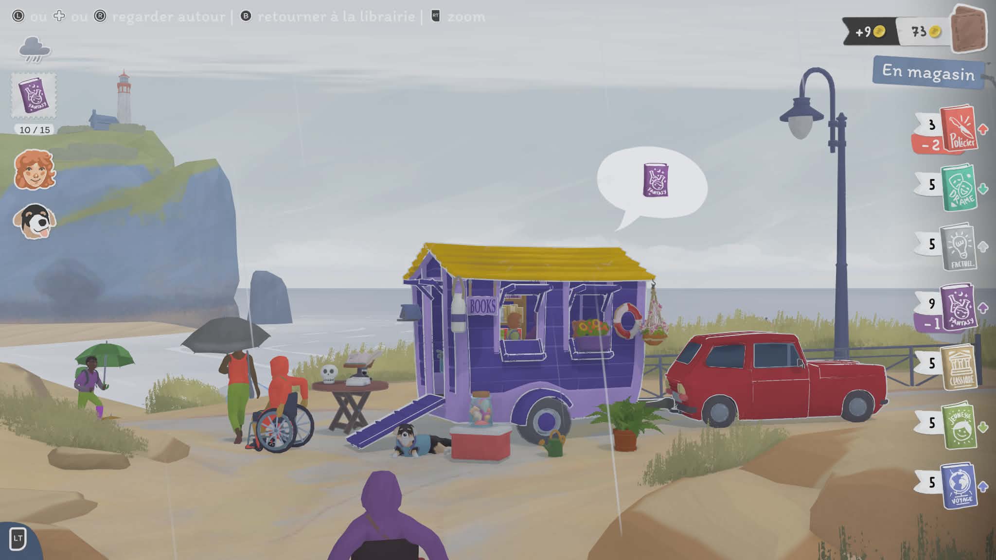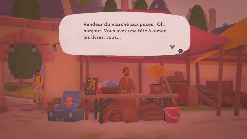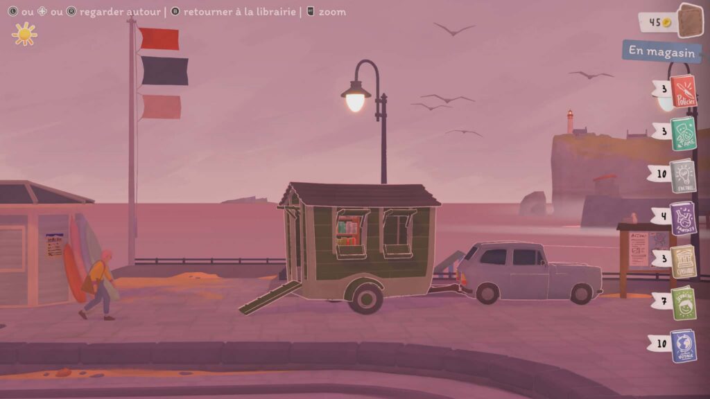 Là où le jeu devient particulièrement intéressant, c’est dans sa structure. Votre librairie n’est pas fixe : vous voyagez de lieu en lieu, chacun ayant sa propre ambiance, ses personnages et ses petites histoires. Chaque endroit propose son lot de quêtes secondaires et de dialogues, donnant vie à cet univers. On ne se contente pas de vendre des livres : on apprend à connaître les habitués, on découvre leurs goûts, leurs habitudes… et parfois même leurs petites histoires personnelles. Ce côté narratif léger mais présent renforce l’attachement au jeu. On a envie de revenir, de voir ce que deviennent les personnages, de continuer à faire vivre cette petite communauté.