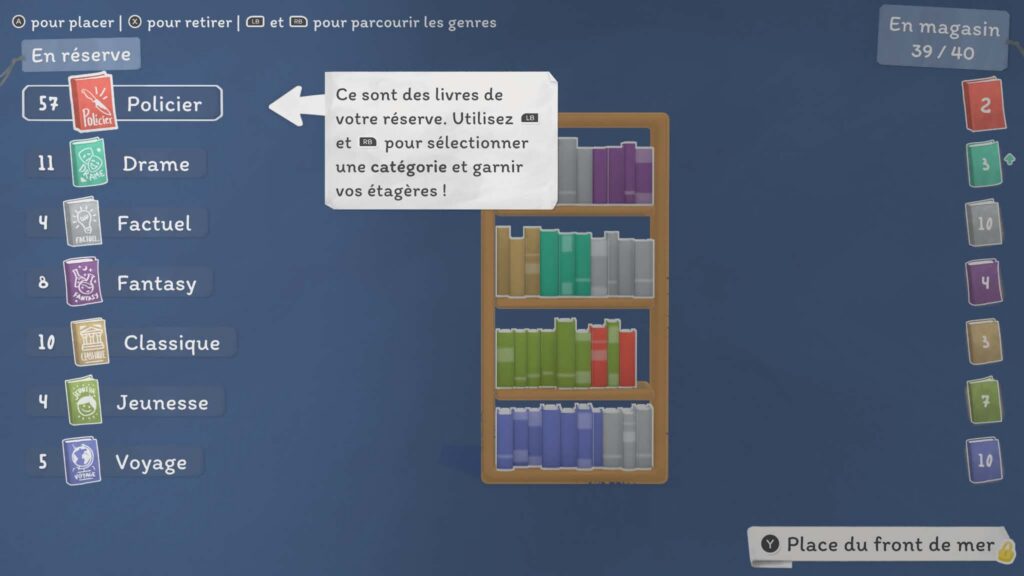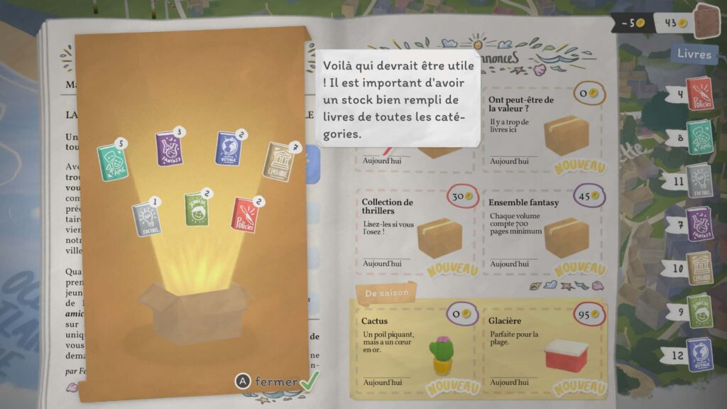 C’est probablement l’un des aspects les plus réussis du jeu. Les clients viennent vous voir avec des demandes précises. Ils peuvent vous dire ce qu’ils aiment, voire citer des livres qu’ils ont déjà lus. À partir de là, à vous de jouer. Vous pouvez consulter les résumés des ouvrages en rayon pour trouver celui qui correspond le mieux à leurs attentes. Et c’est là que le jeu devient particulièrement immersif. On prend vraiment le temps de lire, de comparer, de réfléchir. Ce n’est pas juste une mécanique automatique : on se sent impliqué dans la recommandation. Et quand on tombe juste, la satisfaction est réelle. Autre excellente surprise : une grande partie des livres présents dans le jeu sont réels. Cela ajoute une dimension supplémentaire à l’expérience. On reconnaît certains titres, on se souvient de lectures passées… et parfois, cela donne même envie de replonger dans un livre qu’on avait oublié. C’est un détail, mais il contribue énormément au charme du jeu.