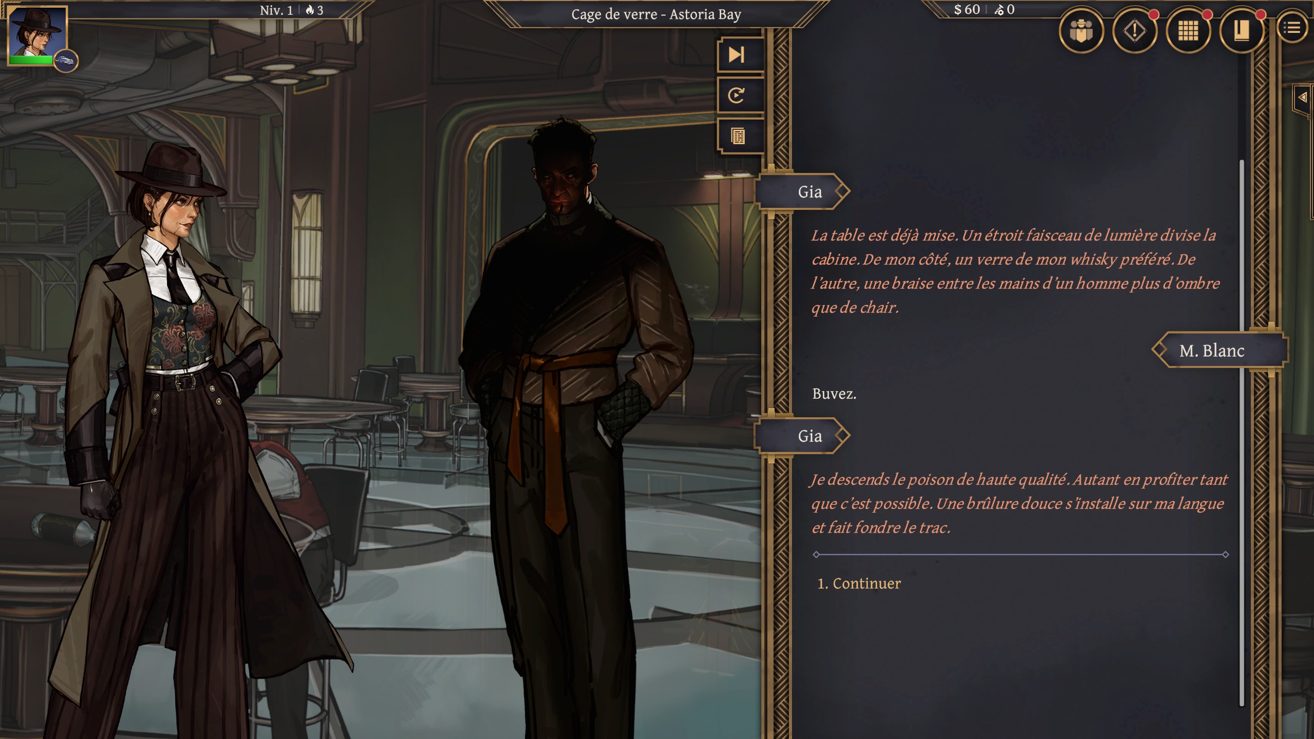 L'atmosphère film noir qui se dégage du jeu de Seismic Squirrel est pour ainsi dire inattaquable : des gratte-ciels suspendus dans les nuages avec les élites perchées au sommet, contrastant avec les bas-fonds infestés de gangs et de trafics. Notre héroïne, Gia, cynique et rusée, s'allie à Nellie, une rebelle en fuite, dans une intrigue criminelle qui nous demandera à plusieurs reprises d'effectuer des choix moraux assez lourds. En sus de l'univers, Aether & Iron bénéficie d'un doublage anglais fort réussi et de dialogues superbement écrits, rappelant un certain Disco Elysium. Malheureusement pour nous, joueurs francophones, on devra parfois composer avec une traduction qui contient quelques erreurs et autres approximations de langue. Rien qui ne nuise à la compréhension globale de l'œuvre, mais ça peut parfois surprendre.