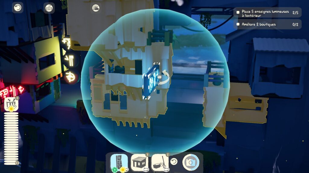 Chaque bâtiment s'améliore en mettant à portée de main un certain nombre d'éléments de types précis parmi les trois qui sont identifiés par des icones : verte (des décorations), jaune (des lumières) et bleue (des objets fonctionnels). Il y a aussi des objets qui n'apportent aucun avantage, juste là pour faire joli ! Et aussi mettre un peu de "bordel" organique. Car ces villes sont loin d'être rectilignes, un sentiment accentué par les modèles asymétriques et les textures d'aspect vieilli.