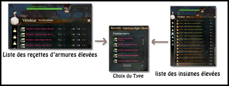 Une fois les recettes acquises, un double clic dessus permet de choisir le type de l'armure ou le type de l'inscription.