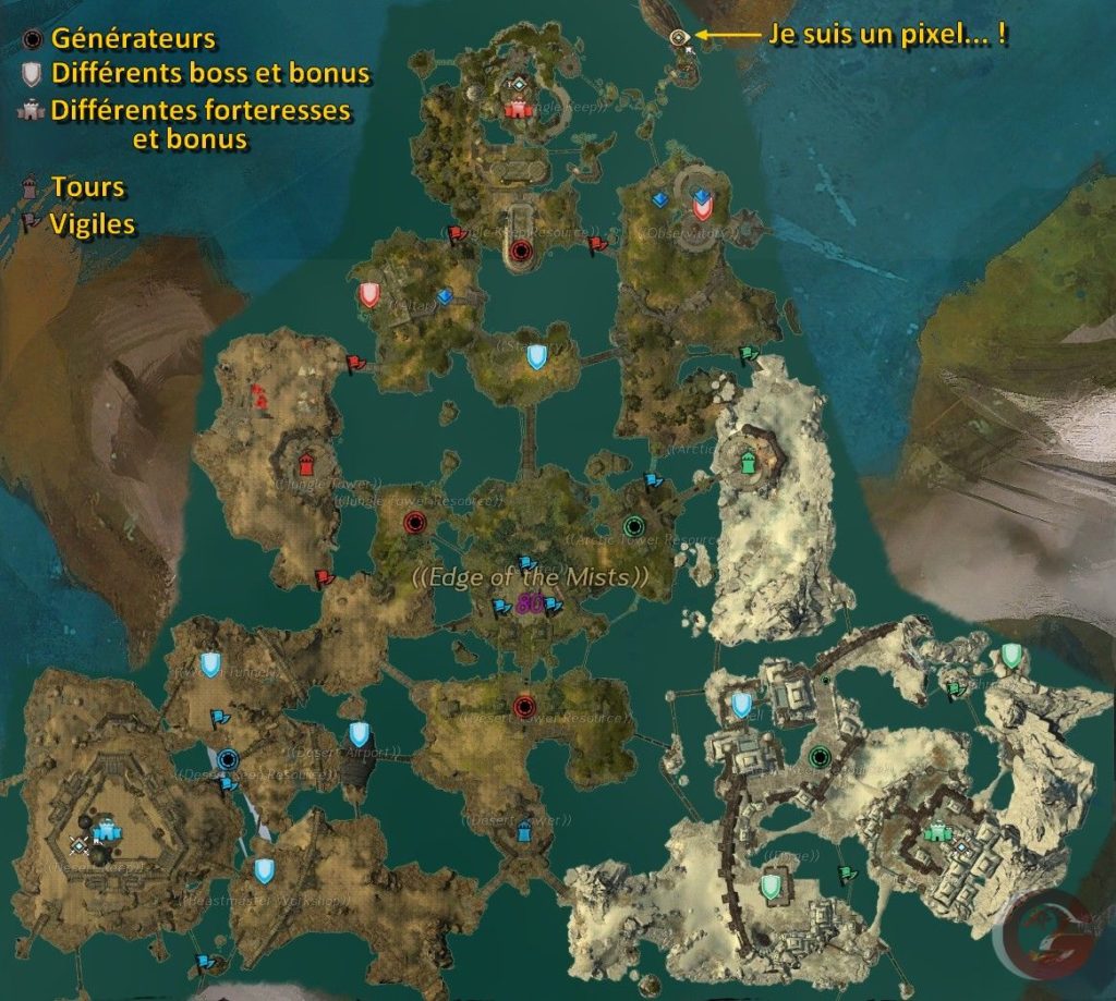 Vous y trouverez des sentinelles/vigiles ainsi que les tours déjà connues. Il existe également 9 World Boss différents sur la carte offrant différents bonus s'ils sont vaincus par un monde. Ceux-ci sont vraiment très très durs à battre. J'ai vu un bus entier se faire tuer en peu de temps. Chacun d'eux possèdent une stratégie propre et une mécanique digne de ce nom !