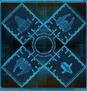 Il y a 5 grands quartiers dans la station : cantina, marché galactique, réserves, entraînement au combat, compétences d'équipage.