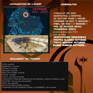 Les règles sont simples, c'est un tournoi 1 contre 1 en duels. Ce tournoi est sur inscription uniquement. Il vous faut envoyer un courrier IG en indiquant votre volonté de vous inscrire à