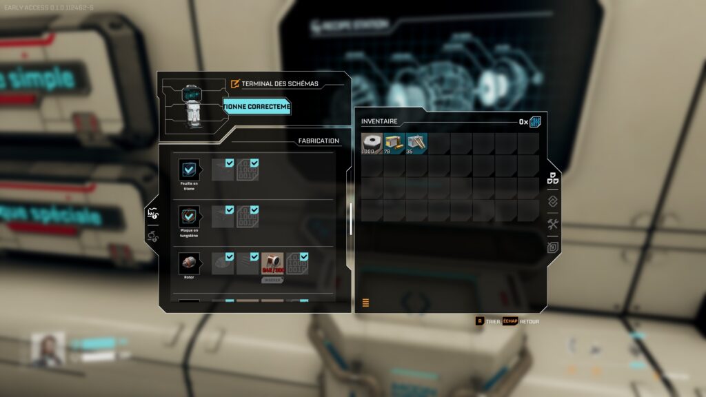 Ces points vont nous débloquer du matériel tel que les armes, les soins, de nouvelles constructions ou recettes. Cela se couple avec les différentes machines qui permettent d'analyser les ressources pour gagner des points ou bien d'autres qui débloqueront des recettes avec des composants que l'on fabrique. Parfois cela demandera d'aller en extérieur pour trouver des plantes, des morceaux de créatures ou des minéraux.